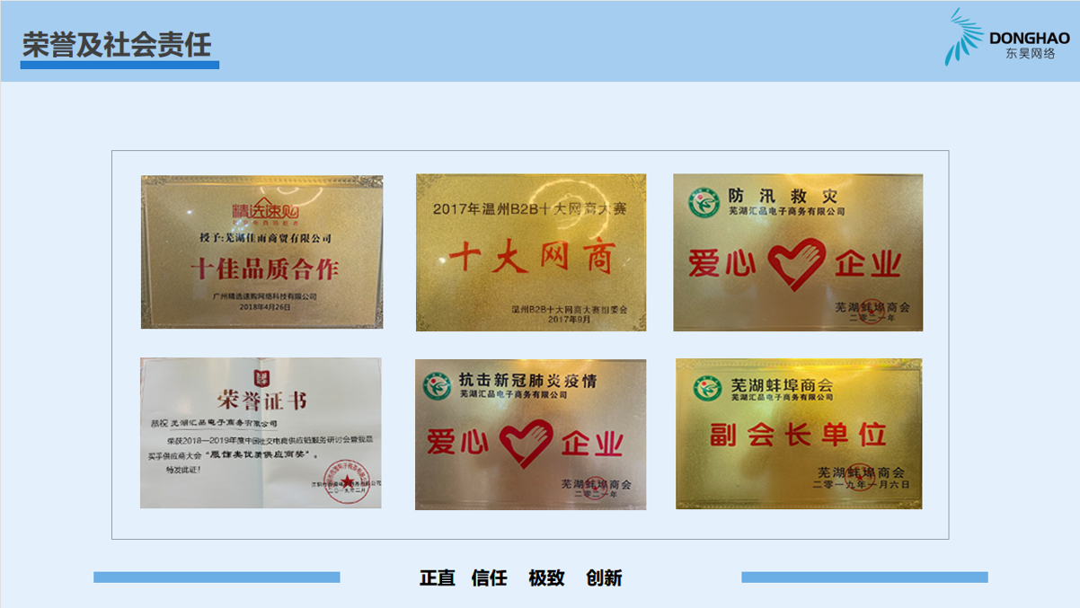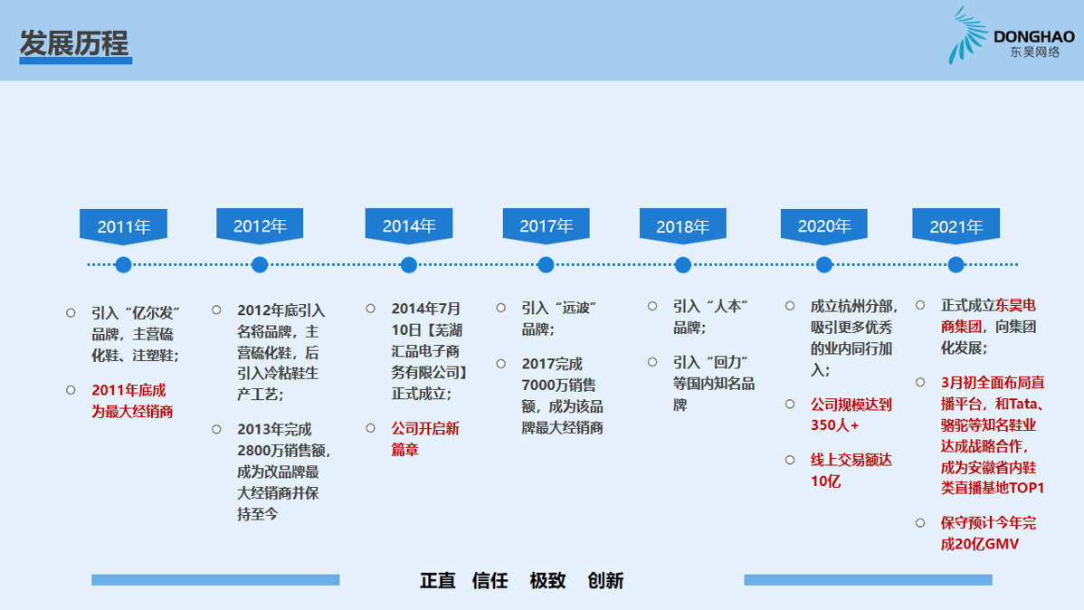 蕪湖東昊網絡科技有限公司,成立于 2014 年,是一家以互聯網平臺銷售為核心的電子商務運營商,公司成立以來,始終專注于休閑運動鞋的互聯網銷售業務,產品線覆蓋硫化鞋、注塑鞋、冷粘鞋,在互聯網二級類目單品牌排名前三,綜合成績排名TOP1;